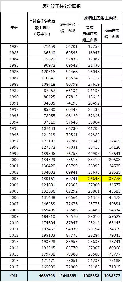 接下来我要放一张很重要的表,从1981年至今的中国城乡全口径住宅竣工面积表。我跟你们讲,为了弄出这张表,老蛮我把建设部和统计局的历年统计年鉴都翻了个遍,连个位数级的错误都不会有。